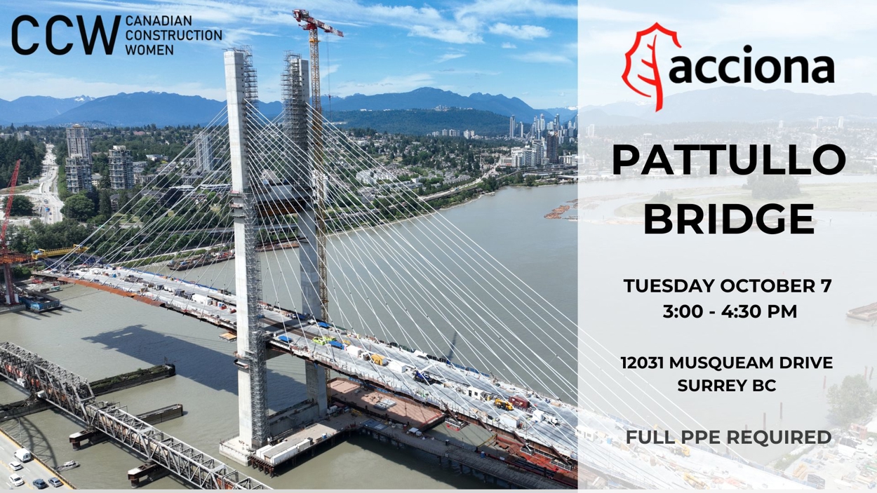 In October, Fraser Crossing Partners will provide a group from the Canadian Construction Women (CCW) with a site tour of the Pattullo Bridge Replacement Project. Attendees will be given a Project overview, along with a boots-on-the-ground tour of the construction progress in Surrey and across the Fraser River, receiving an up-close-and-personal view of the new bridge foundations, ongoing bridge deck construction, and the installation of stay cables and bridge finishings.