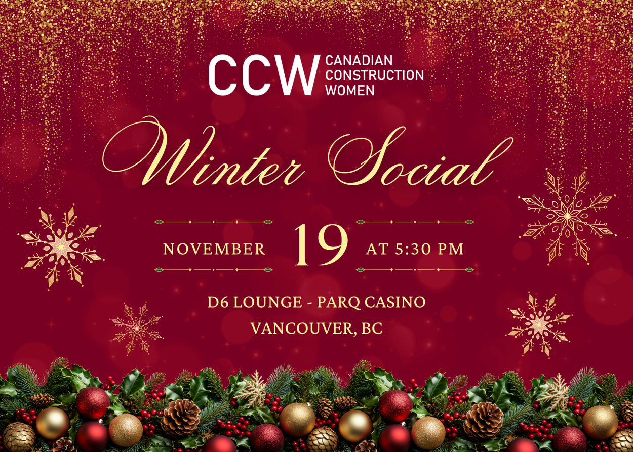 2025 CCW WINTER SOCIALJoin CCW at our upcoming Winter Social on Wednesday November 19, 2025 at the vibrant D/6 Bar & Lounge at the Parq Hotel! Celebrate the season with us and enjoy refreshments, engaging activities, and the opportunity to meet like-minded people dedicated to making connections and a difference. Event Details: Fireside Holiday SocialLocation: D6 Bar & Lounge, 39 Smithe Street, VancouverRegistration begins at 5:30PMOpening Remarks at 6:00PMNetworkingClosing Remarks at 7:45PM General ticket sales begin October 15, 2025. EVENT SPONSORS * CCW is a proud non-profit, volunteer led organization. Tickets are non-refundable but are transferable with a minimum of three days notice prior to the event. Contact events@constructionwomen.org for more information.** Photographs and/or videos will be taken during the event, and may be used by CCW for promotional purposes on CCW's website and social media platforms. By attending this event, you are consenting to CCW using the photographs and videos in which you may appear. *** If you have any dietary restrictions, please email events@constructionwomen.org